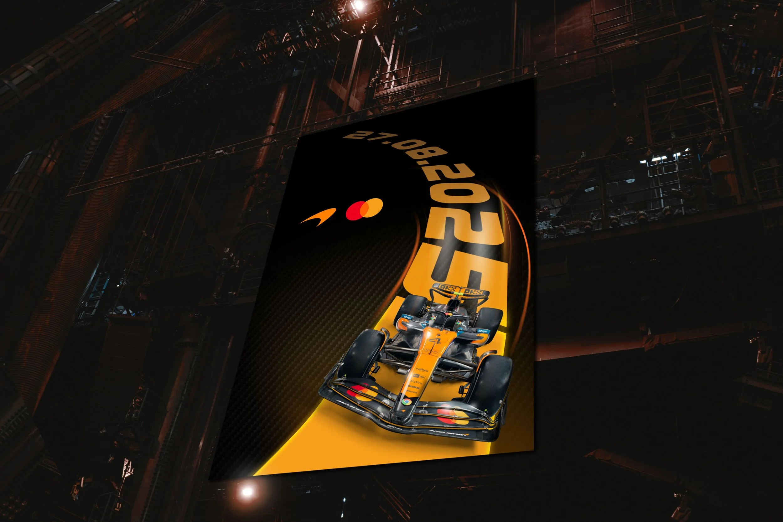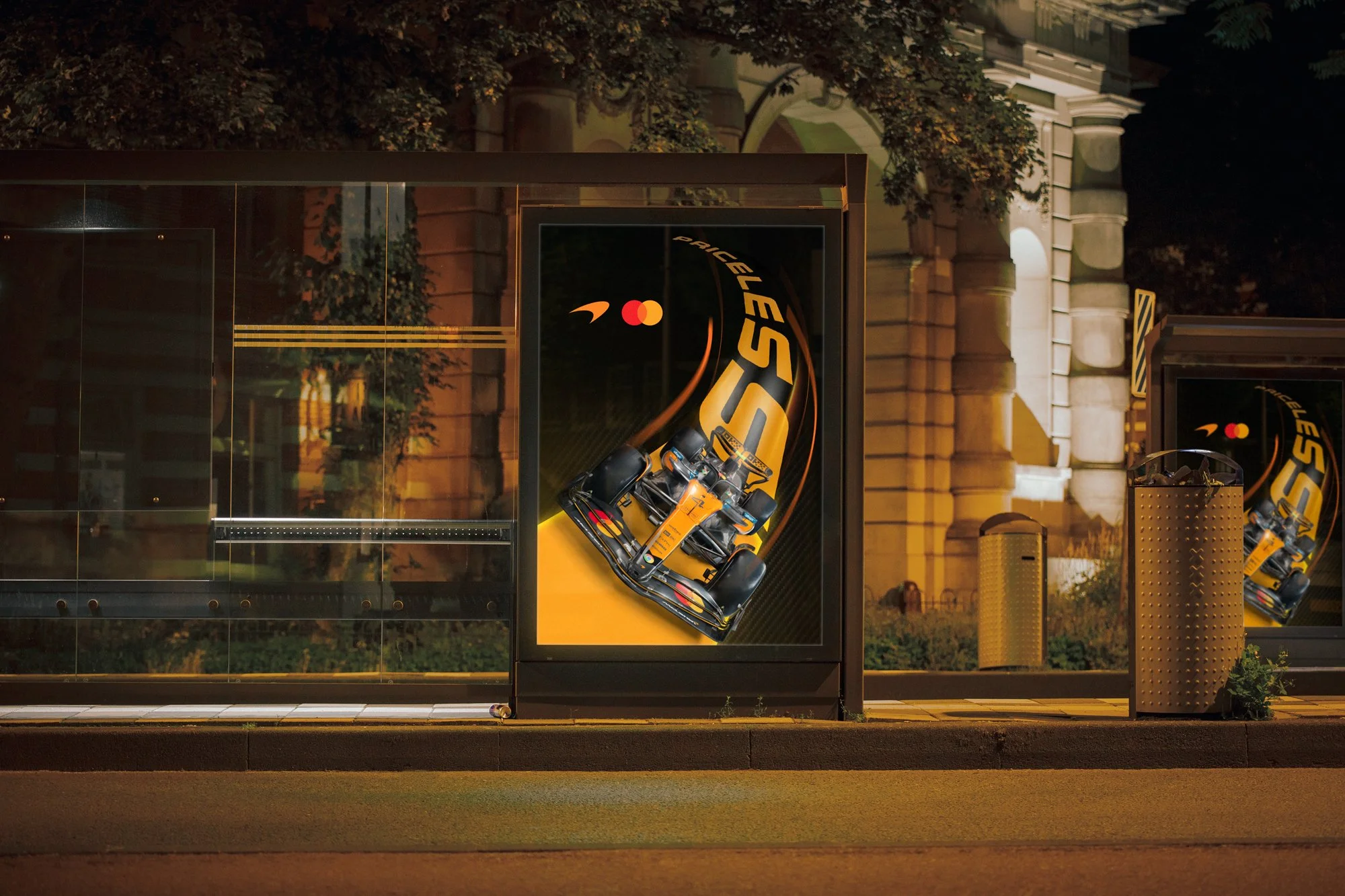 Playing with perspective and bold messaging, we created a fresh look and feel that stayed true to Mastercard’s recognizable brand elements. To announce the news, we collaborated with Reference to create a 3D-rendered world and a dynamic launch film. The video zooms into the Mastercard logo and unfolds into a high-energy, immersive world that captures the spirit and excitement of this new era. The film debuted at the launch event, projected onto the side of the Gashouder Westergasfabriek building in Amsterdam. With drivers Lando Norris and Oscar Piastri, along with DJ Calvin Harris, in attendance, the event embodied what Mastercard does best: putting fans in pole position.